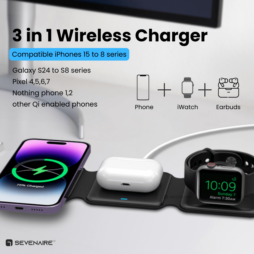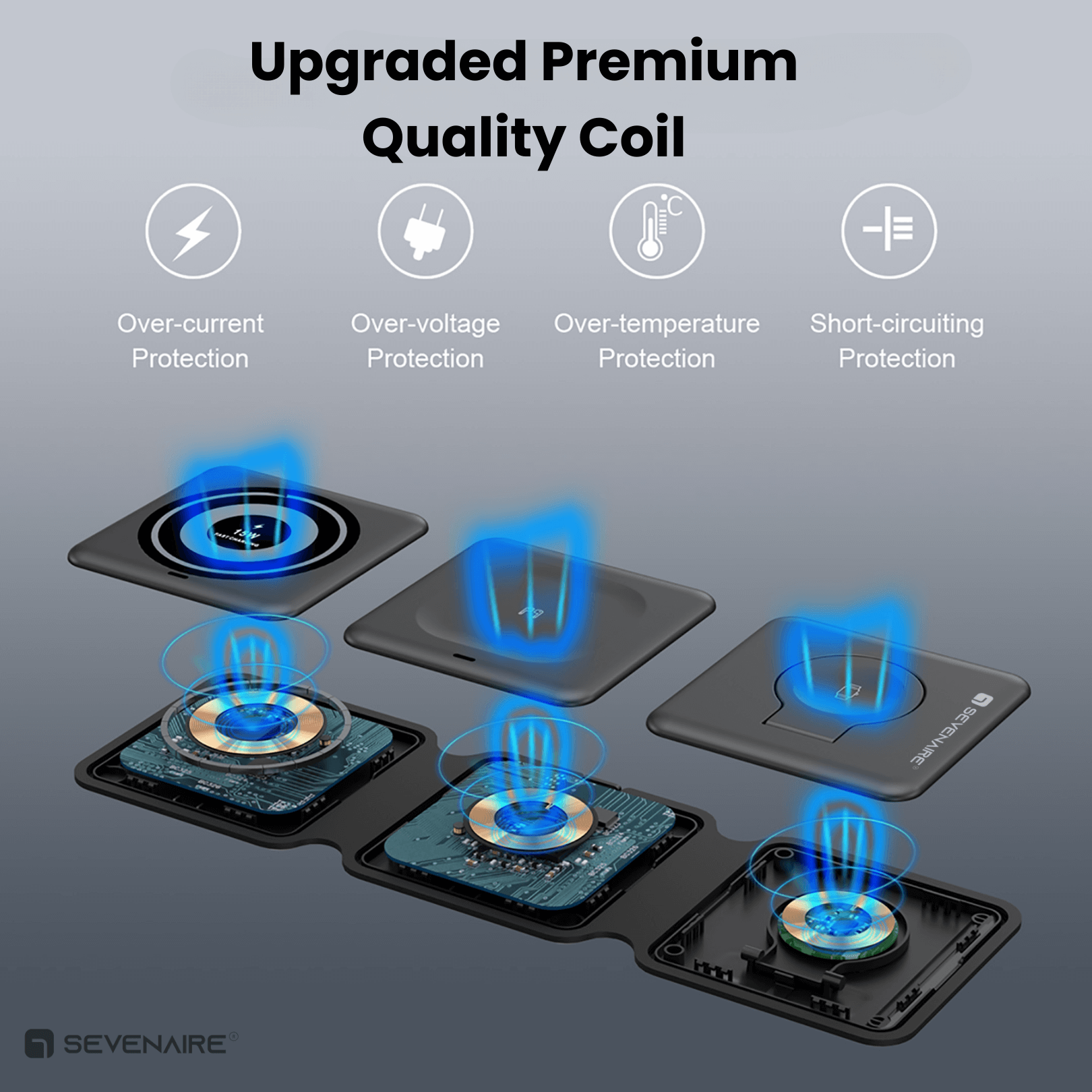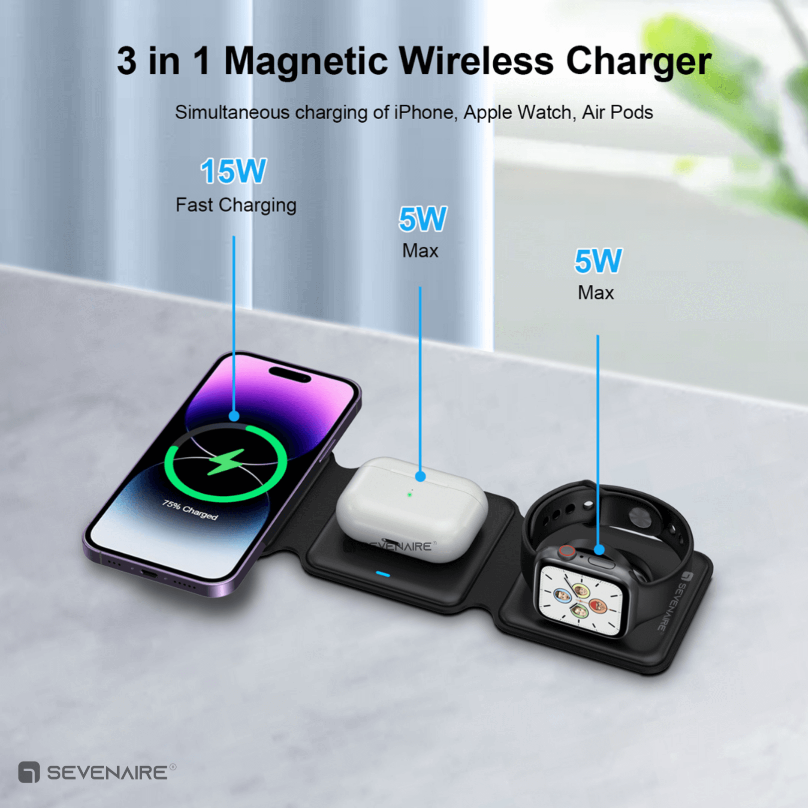 Fast Charging for 3 devices at once on the Sevenaire MagCharge 3 in 1 Foldable Wireless Charger D1970.