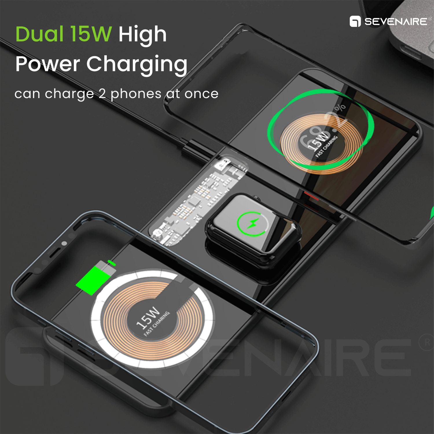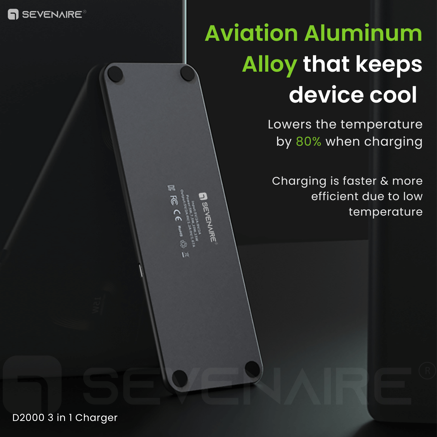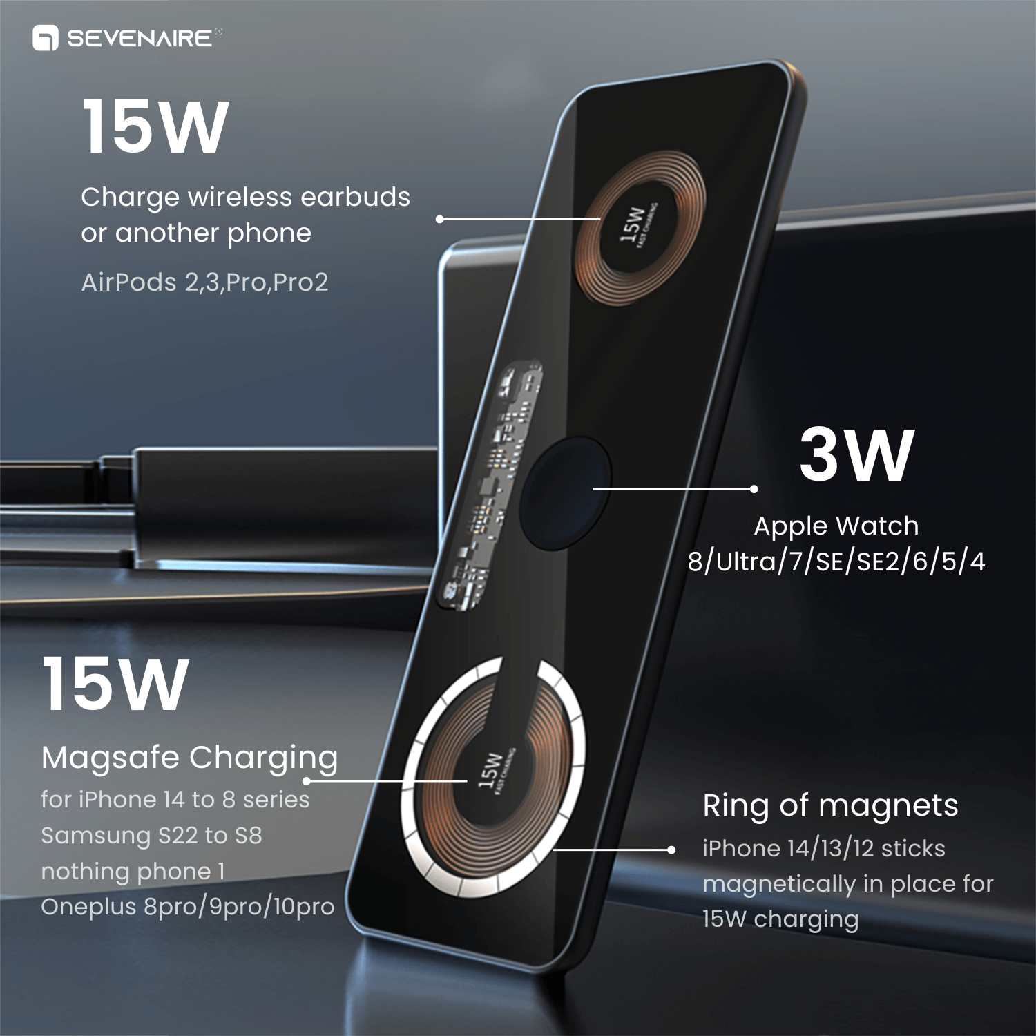 3 in 1 Apple Wireless Charger with 15W Fast Charging for 3 devices at once on the Sevenaire MagCharge D2000 3-in-1 Wireless Charger.
