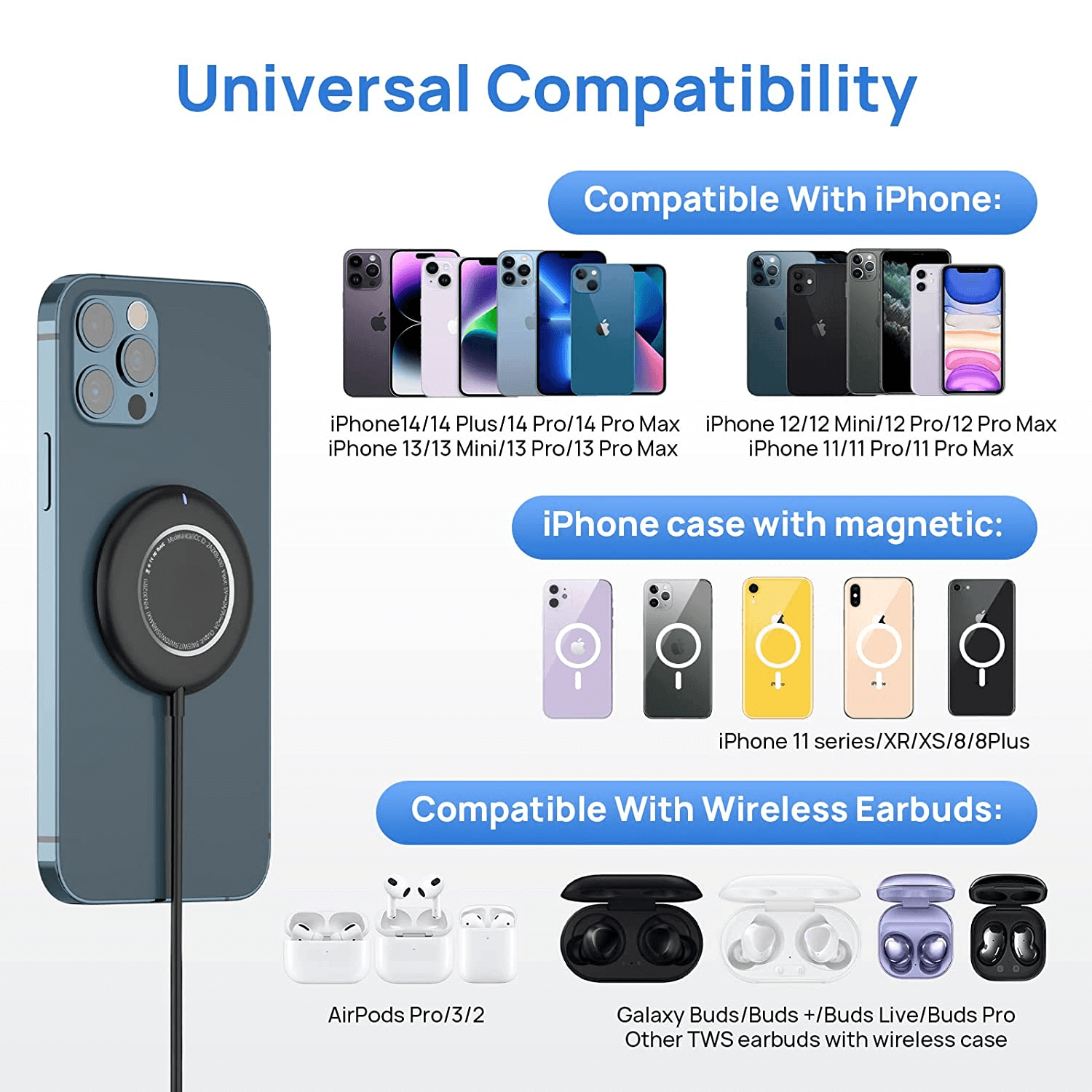 Compatible with iPhone 16 to 12 series magsafe phones. Also can charge wireless charging AirPods and Samsung buds.
