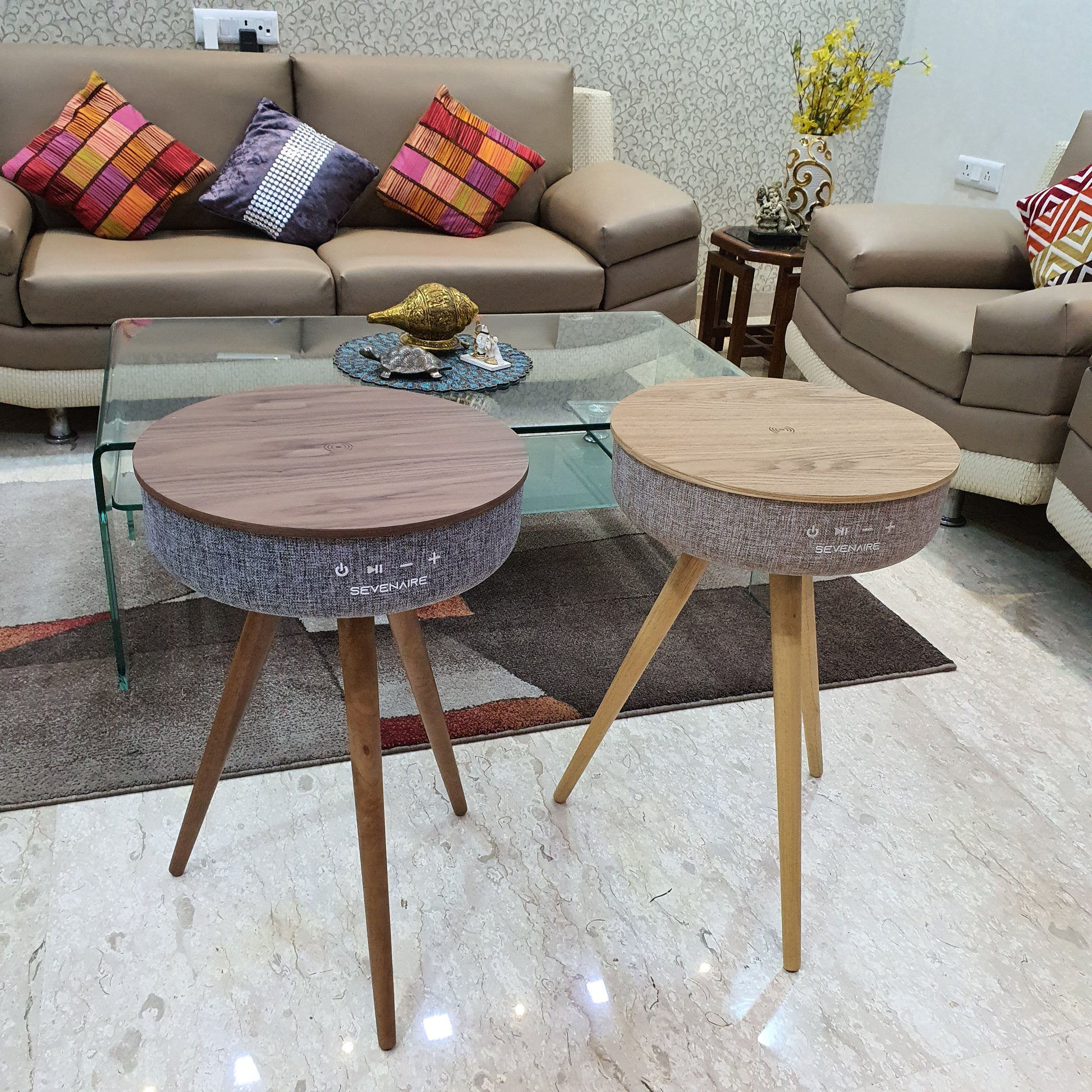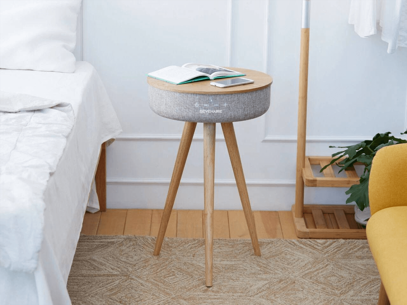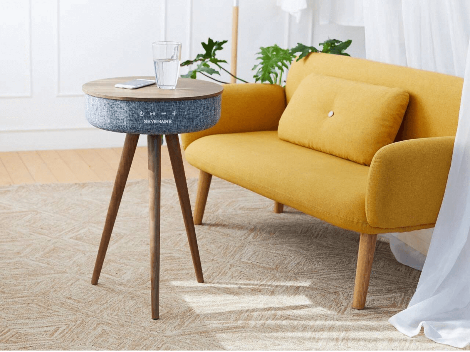 Saturn Speaker Table by Sevenaire is built as a fusion of art and audio innovations. The 360° design projects sound in a consistent and uniform manner for a full surround sound experience. The speaker is packed with specs to deliver captivating and extraordinary sound for the ultimate audio experience. All packed in an elegant oak wood table with premium heather fabric.