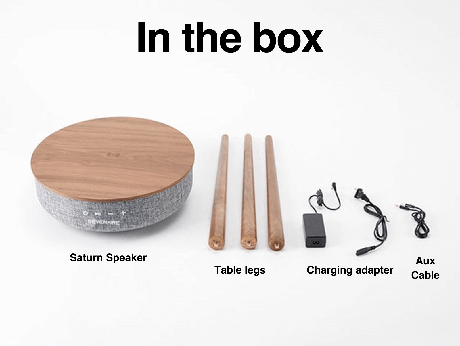 1x Speaker table, 3 Tripod legs, 1x Charging adapter, 1x Aux cable, 1x User manual